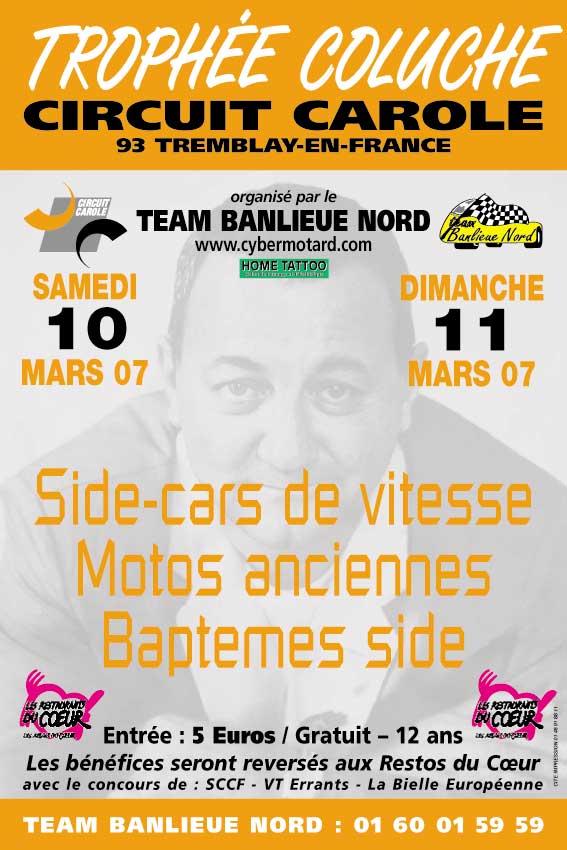 La 13e édition des Trophées Coluche aura lieu les 10 et 11 mars 2007, sur le circuit Carole. Rappel, ce trophée crée par Isabelle Diot du SCCF, apporte son soutien financier aux « Restos du Cœur » autre fondation de Coluche. Même si les Trophées Coluche, exclusivement faites par des motards, pour faire plaisir à d’autres motards, n’a jamais été mise en avant par les médias tradionnels, cette manifestation permet au moins de faire (re)vivre une des passions de l’acteur : la moto.