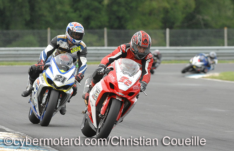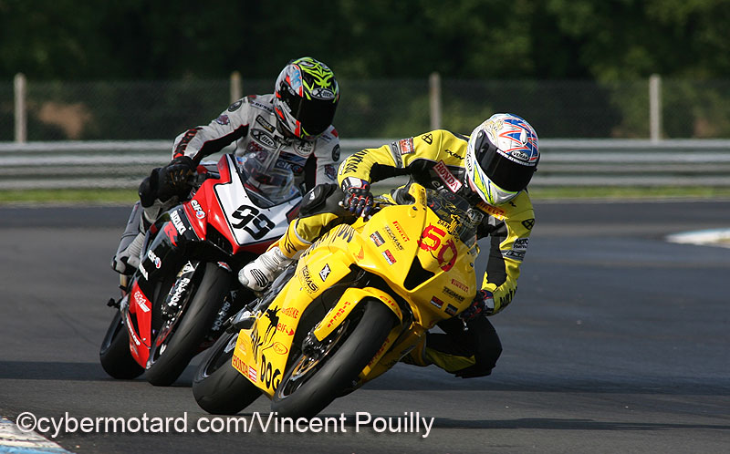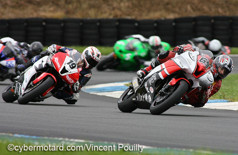 Invité surprise en supersportKevin Denis (Honda N°50) s’impose d’un cheveu devant la Suzuki N°99 d’Olivier Four en catégorie supersport. Pointé 10e au premier tour, Olivier Four termine à 48 centièmes du pilote originaire de Cormeilles en Parisis. Au classement provisoire Kevin Denis fait un bond de 6 places et pointe désormais 9e. |
