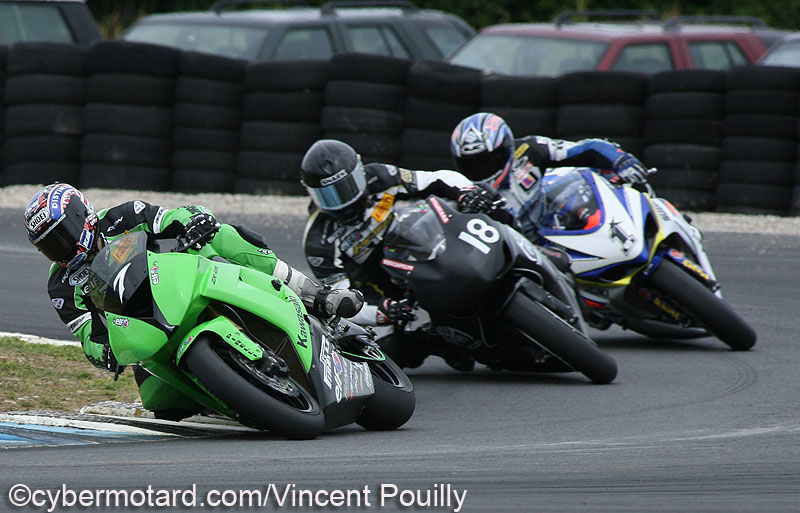 Le retour de Giabbani (2)Gwen Giabbani (N°18) signe lui aussi une belle prestation en course sur sa Honda privée de sponsors : Notez le carénage tout noir ! L’Ex pilote officiel Kawasaki termine 7e au cumul des deux manches. Dans la 1ère partie il talonne même son ex-coéquipier ,Erwan Nigon (N°7) de 20 centièmes. |