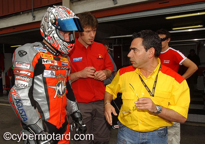 Polémique sur les pneusPatrick Piot (MV Agusta N°3) n’a pas été convaincu par les explications des techniciens Pirelli, quand à sa dotation de pneumatiques. Lors d’une neutralisation il est même allé jusqu’à vérifier lui même la référence du pneu AR monté sur la Suzuki de Metro. |