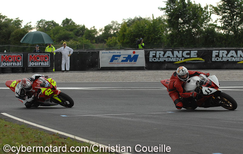 Les deux perdantsLes deux perdants de la catégorie supersport sont Hugo Marchand (Honda N°2) qui n’a réussit à mener que 4 tours avant de chuter. Ensuite c’est au tour de Julien Ruiz, qui le talonne sur Kawasaki N°11 (et 2e temps des essais chronos) de se retrouver par terre au tour suivant. Dommage. |