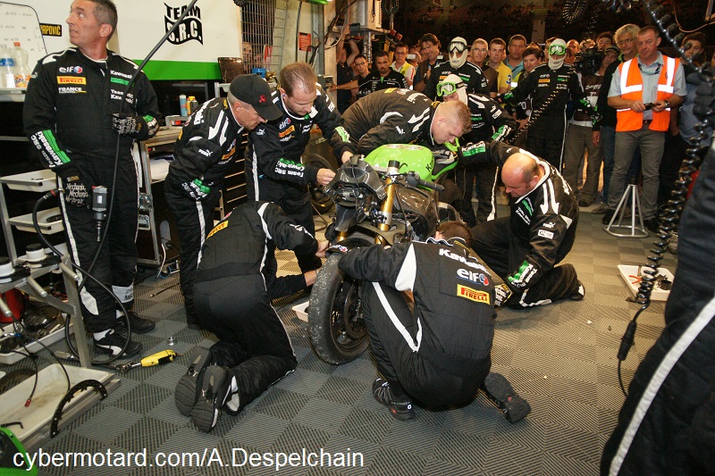 La Kawasaki N°11 a chuté au plus mauvais moment !Le temps de changer le système de fourche avant, la Kawasaki officielle a perdu 7 minutes dans les stands ! |
