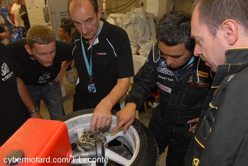 Dominique Arnaud : le maître du tempsDominique Arnaud, du RAC 41, contrôle l’ensemble des paramètres de la course, les temps d’arrêt etc...Avec la chute en début de course a perdu 9’40’’ lors du premier arrêt et 8’55’’ lors du deuxième. La première fois c’était pour remplacer le carénage et les optiques et la 2e fois, de remettre la rampe de carburation en place et purger la moto qui était monté à 128 ° C ! |