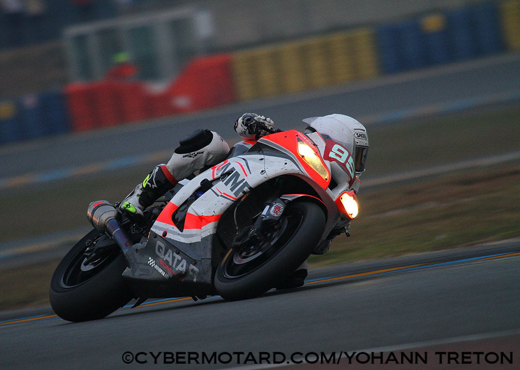 Le QERT leader des Superstock d’ un poil !L’ équipage de la Kawasaki N°95 n’ aura pas le droit à l’ erreur durant la nuit, la Suzuki du Junior Team n’ est qu’ a quelques secondes derrière. Mais pilotes de la 95 sont réguliers et vont affronter la nuit avec sérénité. |