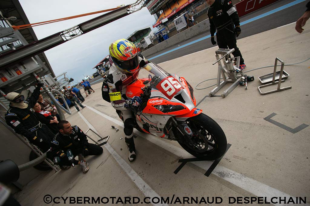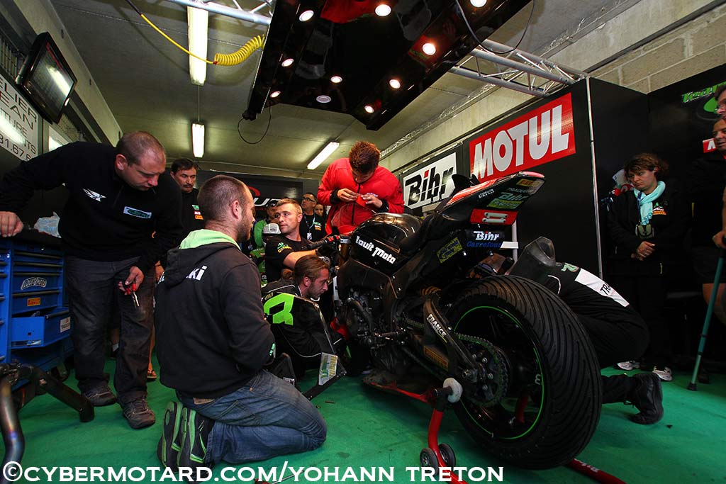 Passage au stand pour la Kawasaki N°33.La Kawasaki N°33 perd la 3e place du podium Superstock dimanche matin aux environs de 9h. Émeric Jonchière repart le couteau entre les dents ! |