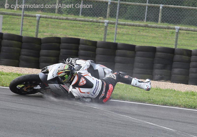 Chute de MassonA deux tours de la fin, alors qu’il tente de prendre l’avantage sur Axel Maurin (Yamaha N°89), Etienne Masson chute ! Heureusement le pilote Bressan arrive à repartir et sauver les points de la 8e place. Au classement provisoire, Etienne qui est officiel Yamaha-Michelin est 5e au classement provisoire. |