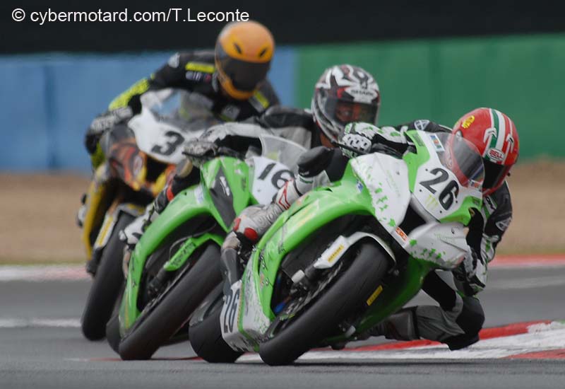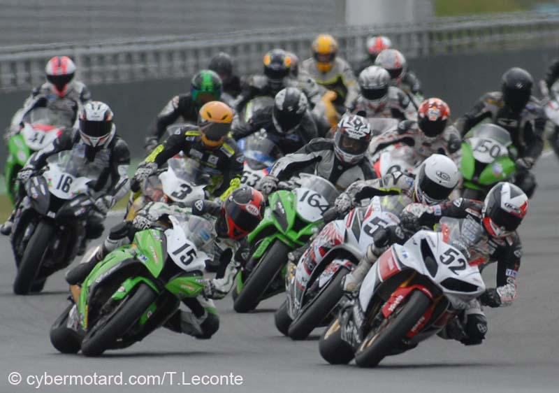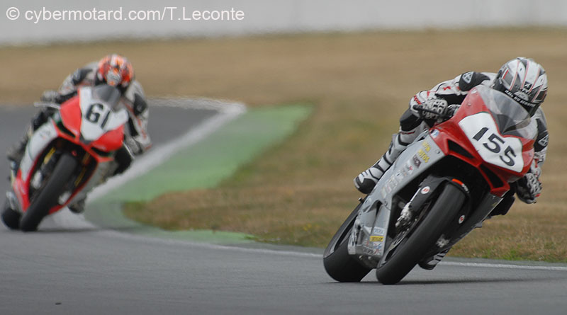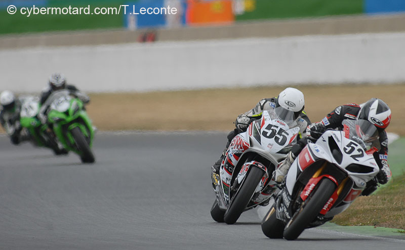 Duel étonnant pour le contrôle de la deuxième place en 1000 promoDès le deuxième tour, un outsider surgit dans les roues de Mathieu Charpin, le pilote qui défend les couleurs de Yamaha Racing France. Il s’agit de Sébastien Gérard (Honda N°55). Ce pilote, issu de la French Cup, est apparu en milieu de saison en Coupes 1000 promosport. Au loin on distingue une paire de Kawasaki : Mathias Chabany (N°164) et Xavier Deletrez ( N°24). |