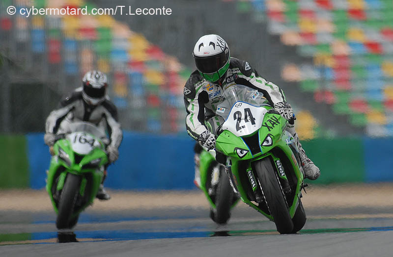 Xavier Deletrez en chasse !Malgré sa 2e place lors des essais chronos, à 61 centièmes de la pole position, Xavier Deletrez (Kawasaki N°24), n’apparaît qu’à la 4e place au 5e tour des 1000 promosport. Auparavant il a dû se défaire de Mathias Chabany (Kawasaki N°164). Hélas peu de temps après il se fait emmener dans la bac à graviers par Sébastien Gérard (Honda N°55). En ne marquant aucun point, le Nordiste perd le bénéfice de la 2e place au classement scratch, qu’il cède à Mathieu Charpin. |