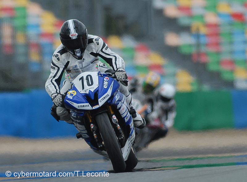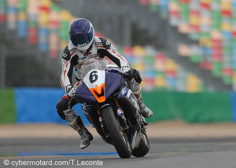 Kevin Longearet a loupé le coche à Magny CoursAlors qu’il avait brillé sur le circuit du Mans, en remportant la finale du 600 promosport, Kevin Longearet (Yamaha N° 54) a semble-t-il été perturbé par l’apparition de quelques gouttes de pluie lors de la finale du dimanche 5 août. Mais rien n’est perdu, puisque Romain Maître ne possède qu’une avance de 18 points au classement scratch. |