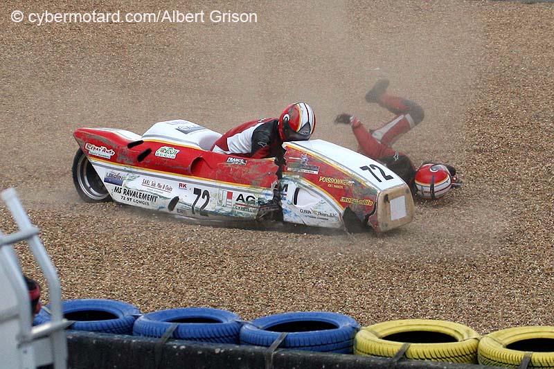 Sébastien surfe sur le gravierEncore une image impressionnante de Sébastien Delannoy et Grégory Cluze lors de leur crash durant le warm-up. A la vitesse à laquelle Sébastien est sortie de piste, le side a surfé sur le gravier. Grégory a bien fait de lâcher les poignées car en fin de course, le side s’est écrasé côté panier sur les pneus. On peut noter le côté très pro de Sébastien en train de gérer la situation ! |