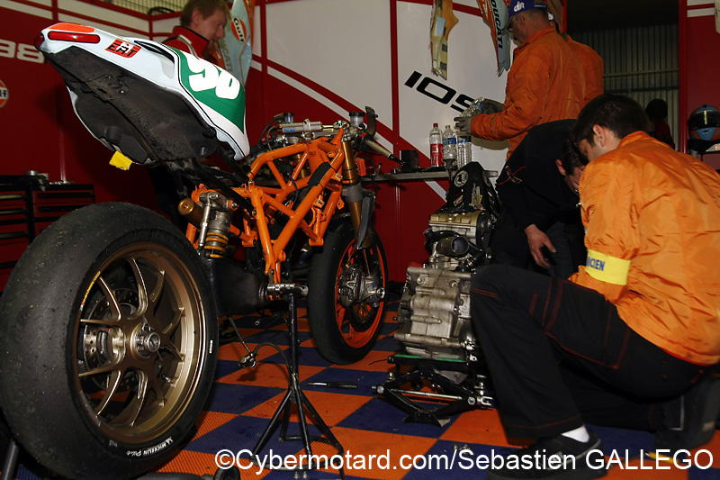 La Ducati N°98 en phase complète de démontage, les mécanos attaquent le remplacement de la boîte de vitesse qui devrait prendre près de 2 heures. |