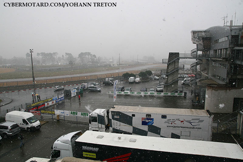 La neige est tombée drue sur le circuit et le paddock du circuit du Mans. Résultat toutes les épreuves du samedi ont été annulées. |