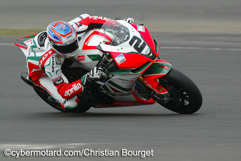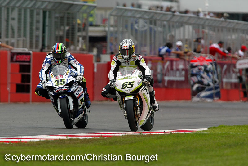 Camier devant Biaggi, une révolution ?Leon Camier (Aprilia N°2) évolue lui aussi à domicile pour cette épreuve de Silverstone, même si en première manche il ne termine que 6e, en seconde le pilote officiel Aprilia réalise l’ exploit de monter sur la dernière marche du podium. Grâce à cette troisième place, Camier remonte à la 8e place au classement provisoire. |
