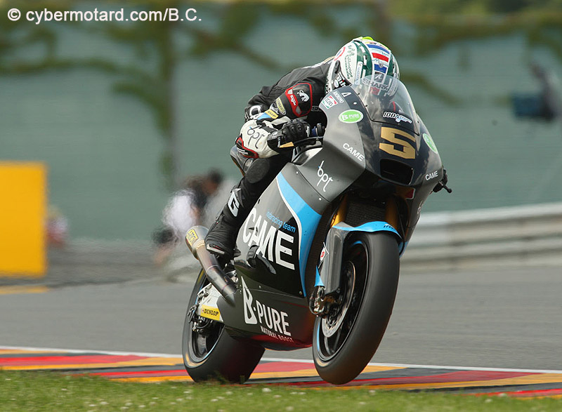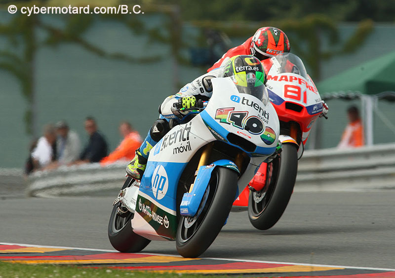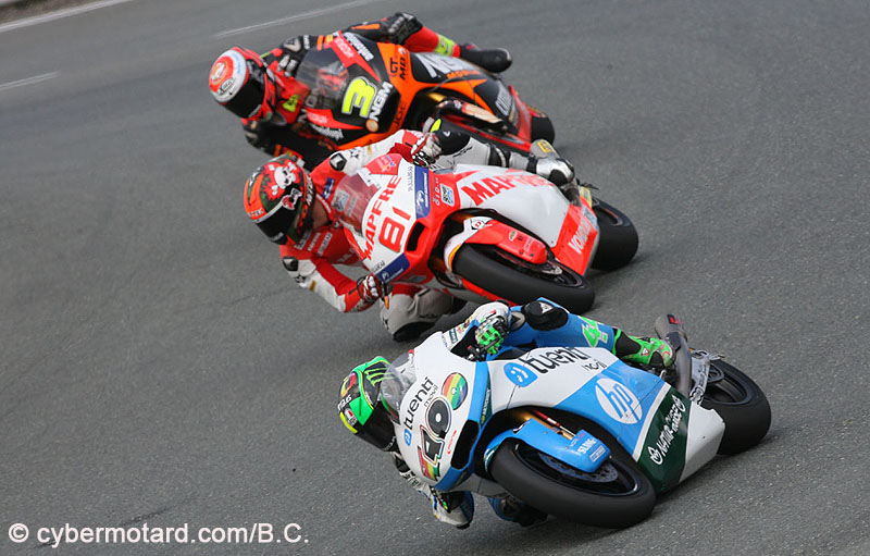 Jordi Torres, car c’est de lui dont il s’agit, s’est bien calé dans les roues de Pol Espargaro et le passe à 10 tours de la fin de course. Du coup Simone Corsi (N°3) en profite lui aussi pour passer le pilote du team Tuenti HP 40, qui du coup doit se contenter de la 3e place du podium !