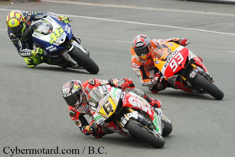 Les seconds couteaux en profitent pour tirer leur épingle du jeu. Valentino Rossi (Yamaha N°46) retrouve la première ligne en qualifications (cela ne lui était pas arrivé depuis Le Mans en 2010). L’Italien réalise le holeshot, mais il est rapidement repris par un Marc Marquez (Honda N°93) déchaîné. Le jeune Espagnol aligne les tours rapides tel un métronome survitaminé. Il empoche sa 2e victoire de la saison… et devient le nouveau leader de la catégorie reine !
