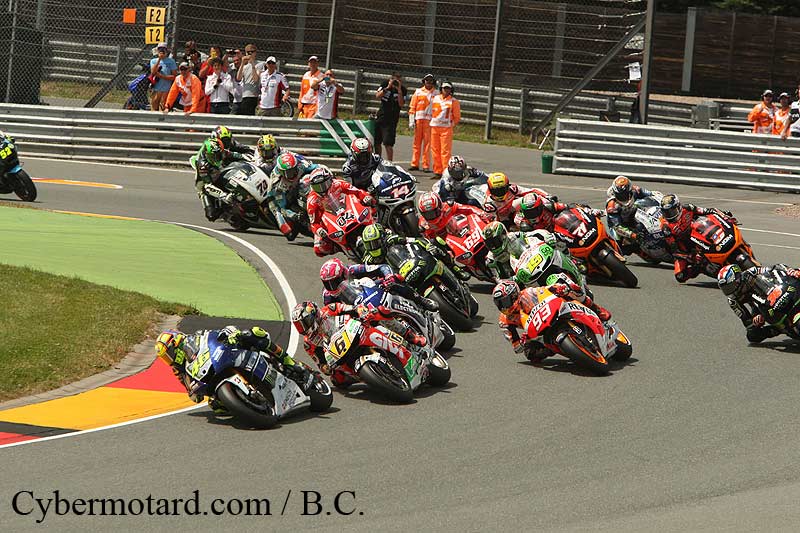 Cal Crutchlow est visiblement à l’aise sur le tracé allemand et prend le meilleur sur Rossi. Belle performance du Britannique, dont les mauvaises langues murmurent qu’il aurait récupéré la machine officielle de Lorenzo, camouflée sous un carénage Tech3…. Il termine 2ème et le « Docteur » complète le podium – son second d’affilée.