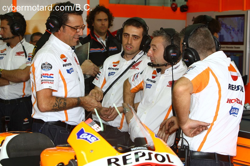 En effet l’équipe technique de Marc Marquez était constituée cette saison des « anciens » de l’équipe de Casey Stoner, dont une majorité d’Italiens. Avec le chef mécano Bruno Leoni, l’ingénieur électronicien Carlo Luzzi, l’ingénieur informaticien Giulio Nava, et les mécaniciens Andrea Brunetti, Roberto Clerici et Filippo Brunetti.