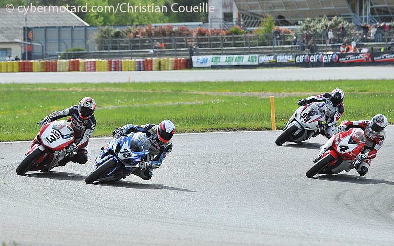 Gros baston pour la 4e place du superbikeLe quatuor composé de David Muscat (2e temps des essais sur sa Ducati Michelin), Antony Delhalle (Suzuki) et les duettistes Honda-Mecasport Mathieu Gines (4) et Hugo Marchand (99) s’ est bagarré comme des chiffonniers jusque sur la ligne en 1ere manche . On voit Delhalle et Muscat « se frotter » dans le dernier tour. Au final, Gines s’ impose devant Delhalle , Muscat et Marchand . |