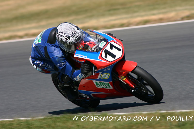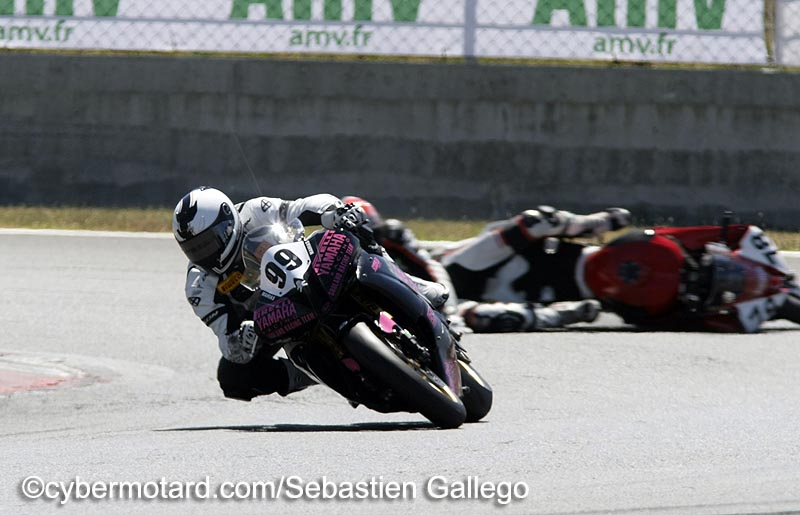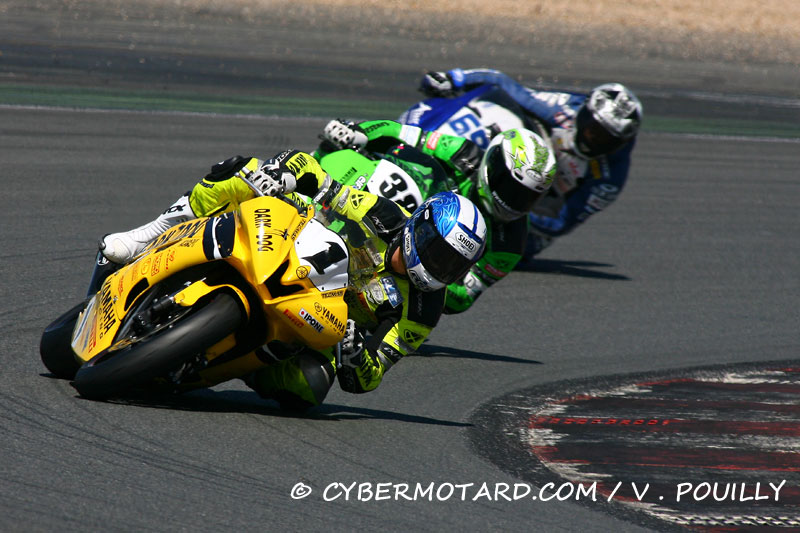 <A name="bulleMC2010">1er victoire de Louis Bulle en Supersport.</A>Alors que Gines et Leblanc s’attaquent, il en est un qui se fait discret, mais non moins présent : Louis Bulle. Et bien à lui d’être resté en embuscade derrière les leaders tout au long de la course, puisque dans le dernier tour, à trop s’arsouiller, Gines part au tapis avec Gregory Leblanc. Louis a alors la voie libre pour passer le drapeau à damier en 1ere position. A ses coté, Etienne Masson monte sur le podium, avec Gregory Leblanc, qui a pu repartir. Mathieu Gines lui fait choux blanc sur cette opération. Louis Bulle remporte ici, sa première victoire de la saison, ce qui lui permet de conforter sa 3e place au classement scratch. |