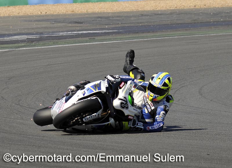 Chute de Freddy Foray.Freddy Foray (Suzuki n°78), voulant peut etre revenir un peu trop fort sur Julien Da Costa, en 3e position, part à la faute dans le virage du 180°. |
