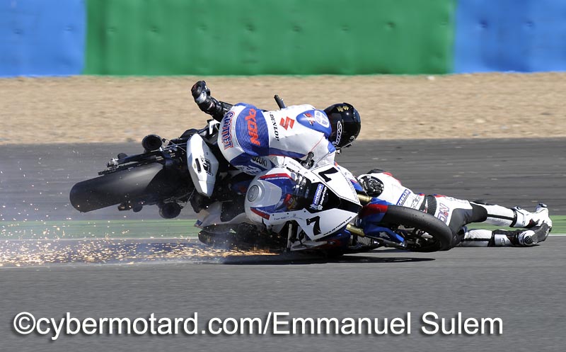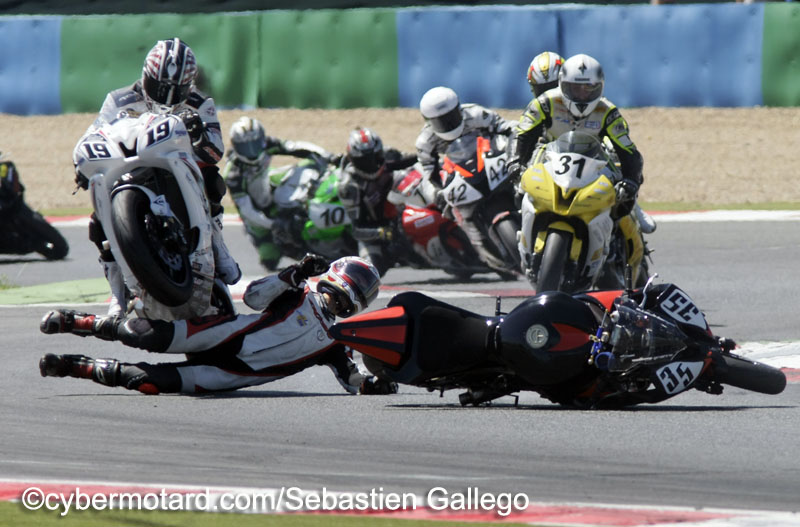 Chute du leader en Superbike.Feu vert pour la 1ere manche des Superbike. Le circuit de Nevers est alors le théâtre d’un sacré rebondissement : passé le premier virage, Erwan Nigon (BMW n°7), poleman et leader de la catégorie, part à la faute. Il emmène avec lui Baptiste Guittet (Suzuki n°5) et Olivier Four (Kawasaki n°99). Seul Olivier Four arrive à repartir. |