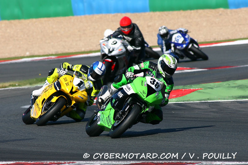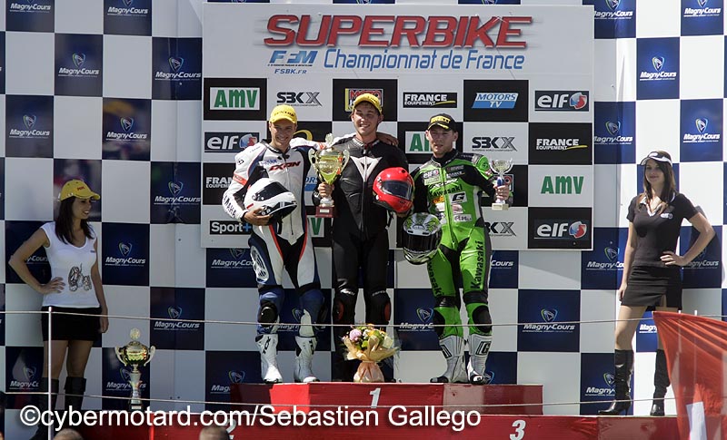 Erwan Nigon déclaré vainqueur de la course 2 Superbike.Au départ de cette seconde partie de la 2e course des Superbike, Gimbert fait le meilleur départ suivi de Julien Da Costa et Erwan Nigon. Très rapidement Nigon récupère la 2e place, pour franchire la ligne d’arrivée juste derrière Gimbert. Da Costa est 3e, suivi de Freddy Foray. Cependant, la victoire se faisant au cumul des deux parties, Erwan Nigon est déclaré vainqueur de la course devant Gimbert et Da Costa. |