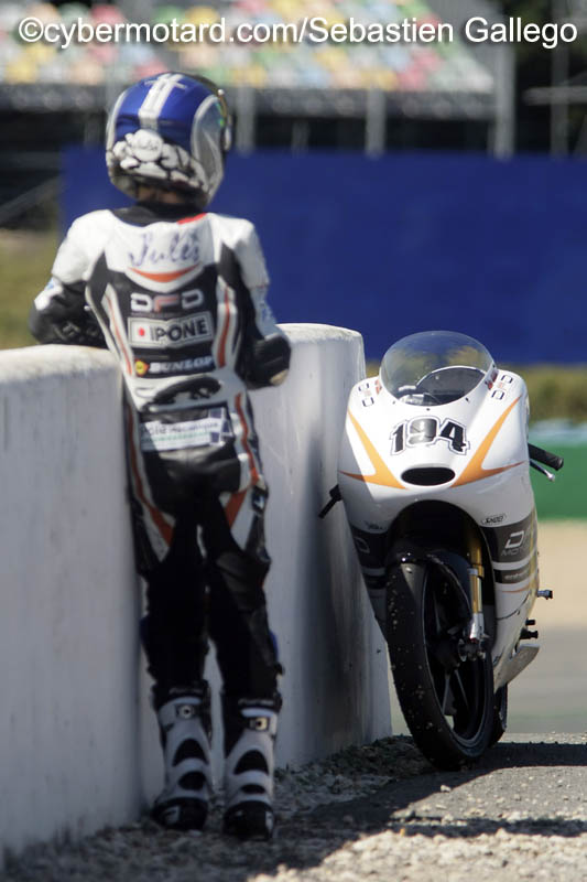 Jules Danilo, contraint à l’abandon.En catégorie 125cc, Jules Danilo fait le meilleur départ. Il tient les commandes de la course durant quelques tours, avant que la malchance le gagne : son moteur serré, Jules est contraint d’abandonner. |