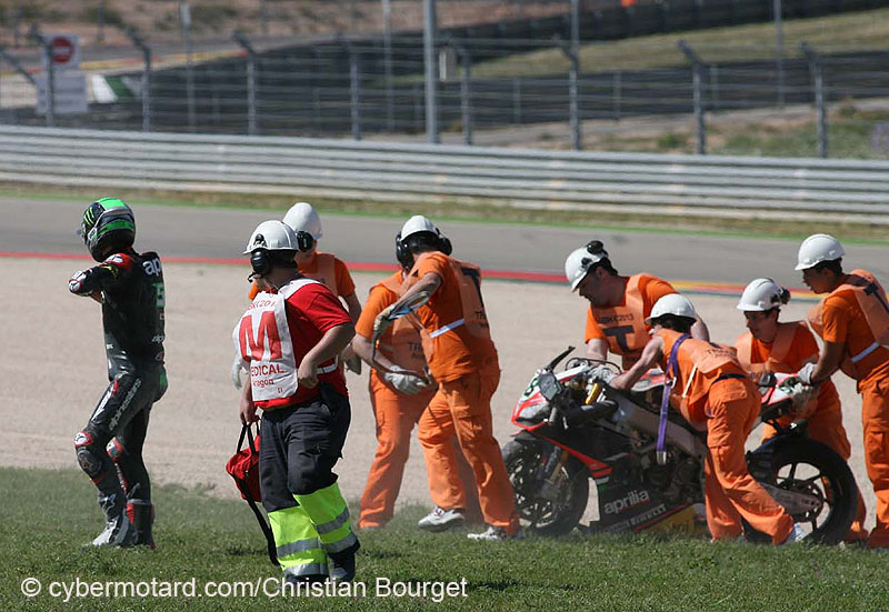 Son co-équipier Eugene Laverty (Aprilia N°58) pourtant ultra favori, a abandonné lors de la 1ère manche sur problèmes techniques. Puis comble de malchance, il chute lors de la 2e manche dès le 2e virage alors qu’il se mesure à Tom Sykes (Kawasaki N°66) !