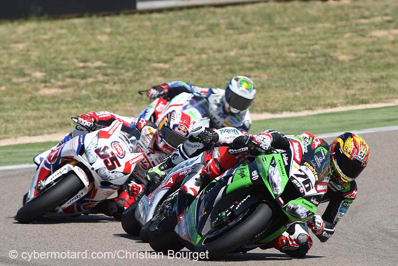 Les Français brillent à Aragon ! Ici Loris Baz (Kawasaki N°76) est à la lutte avec Jonathan Rea (Honda N065), un pilote qui attaque se 6e saison en WSBK ! Dans le fond on distingue Jules Cluzel (Suzuki N°16) qui finit 7e en 1ère manche ! |