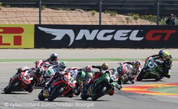 La première manche s’annonçait palpitante, avec la pole de Tom Sykes ( N°66) Mais c’est bien Eugene Laverty (Aprilia N°58) qui signe le holeshot. Hélas les deux hommes seront tour à tour obligés d’abandonner ! |