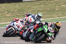 Tom Sykes (Kawasaki N°66) prend provisoirement la direction des opérations dans la première manche, devant Chaz Davies (BMW N°19) et Sylvain Guintoli (Aprilia N°50). Hélas cela ne durera qu’un tour avant que Tom Sykes abandonne ! |