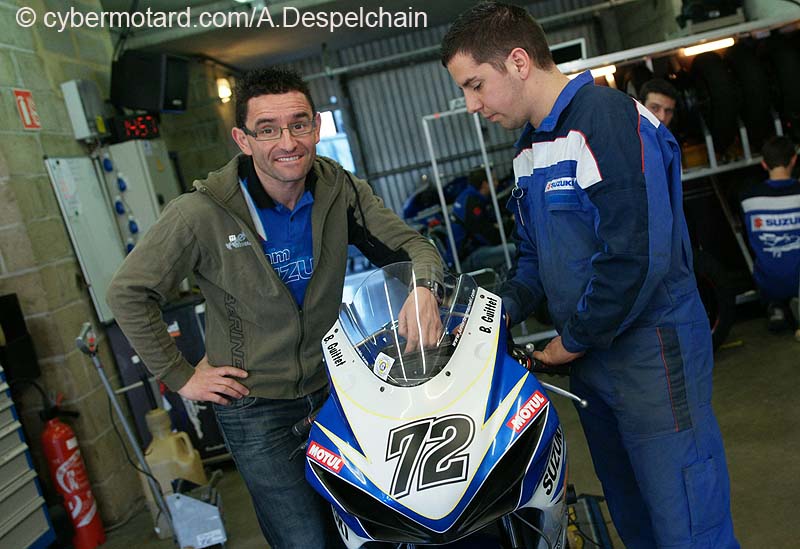 Damien Saulnier, le pivot de l’équipe Suzuki JuniorDamien Saulnier a la double casquette de formateur au sein du lycée LMS et de team manager du « Junior team Suzuki » : « Nous démarrons cette nouvelle saison avec de nouveaux élèves motivés et trois motos : une 600 cm3 confiée à Baptiste Guittet et deux 1000 cm3 GSXR que piloteront Anthony Dehlalle et Vincent Phillippe . On a eu une bonne préparation hivernale, les motos sont prêtes , les moteurs de course rodés et puis repartir avec les mêmes pilotes c’est toujours plus sympa. Je suis là pour veiller à ce que la cohésion entre pilote, moto et mécanos se fasse bien car confier "sa vie" tous les ans à de nouveaux mécaniciens n ’est pas simple |