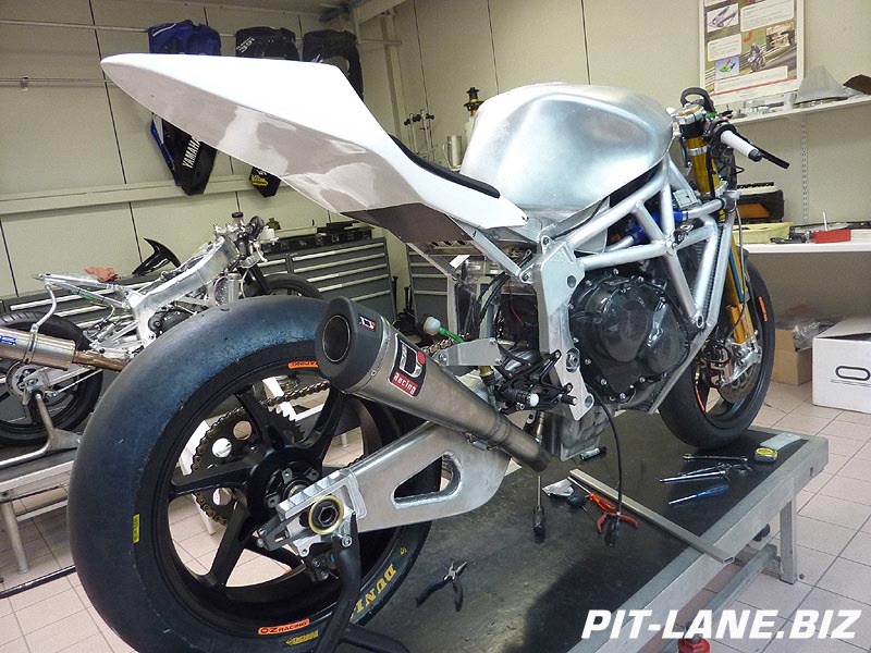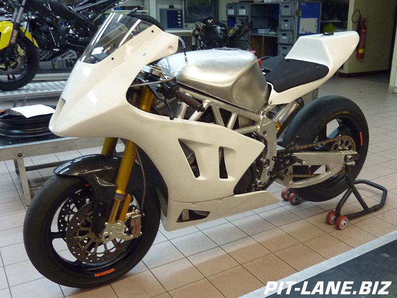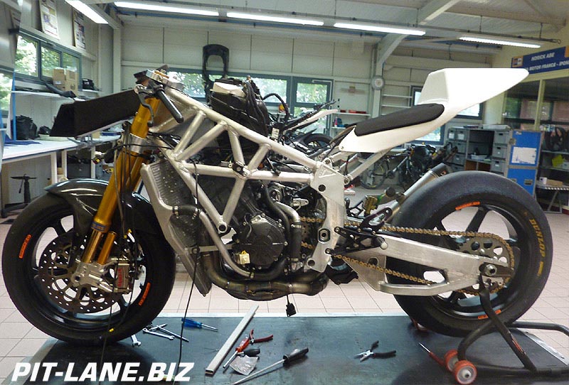 Un prototype brut de décoffrageLe prototype du Moto2 dans les ateliers de Martial Garcia en Haute Savoie. Cette machine a été terminée 48H à peine, avant de prendre la route vers le circuit d’Aragon. Cela explique pourquoi le carénage, ICP Caretta ( le même que celui de Baldolini) est lui aussi brut de décoffrage. |