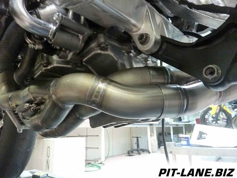 Greffe sur un cadreLe bras oscillant est issu des ateliers de MG Compétition. Enfin sur le châssis on a greffé : une suspension Öhlins, des freins Brembo, un radiateur Taleo, des roues OZ et un échappement Devil, of course ! Le réservoir en aluminium est fait sur mesure, il est très étroit au niveau des genoux. |