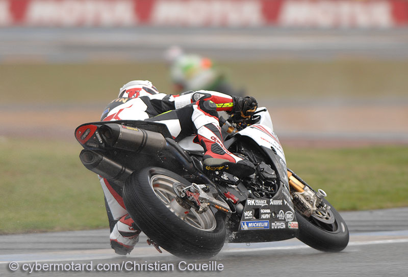 Toutes les motos équipées de pneus Michelin ont superbement tenu la piste sous la pluie. On a pu noter près de 6 secondes au tour entre la Suzuki (Dunlop) et la Yamaha N°7 ! |