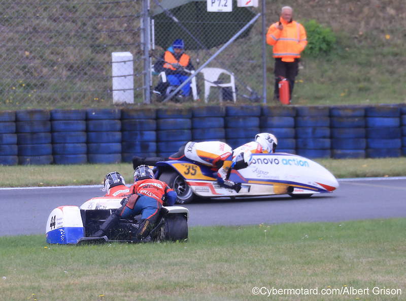 Gazon pour les ChristieDans la première séance chrono, sur une piste bien mouillée. Ils ont tiré tout droit au bout de la longue ligne droite du retour, donc un endroit assez critique, mais sans souci, du grass-track parfaitement maîtrisé ! |