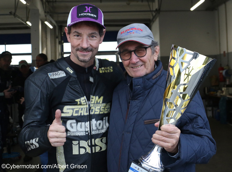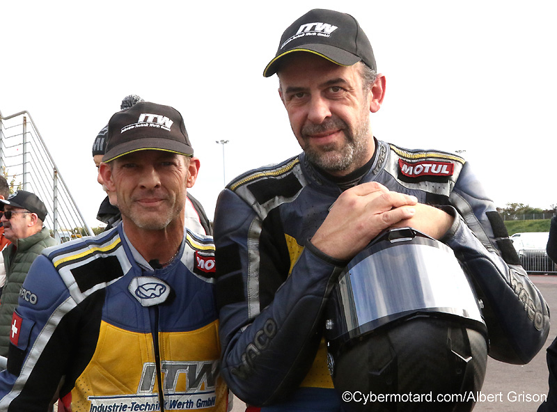 Thomas Hofer avec Markus VenusUn passager suisse, à gauche, qu’on connaît bien en France car il roulait jadis avec un autre suisse, pilote, dans notre championnat FSBK, Lukas Wyssen. |