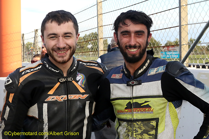 Guillaume Péchoux et Lylian Charroin sont de passageIl s’agit de Guillaume Péchoux (à gauche), le pilote et Lylian Charroin son passager, pour une première apparition en FSBK, lesquels viennent du Promosport. Ils ont bien fait de venir et se faire connaître car ils font 2 podiums ! |