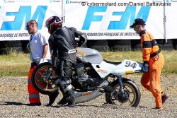 Samedi, course 1, Chute de Willem ZimmermanAu tour suivant, Willem Zimmerman chute dans le virage à droite après la chicane. Le drapeau jaune reste agité pendant plusieurs tour à cet endroit alors que la moto reste dans le bac à sable, protégée par un matelas. Finalement, les commissaires aidés par le pilote parviennent à dégager la moto dont la roue avant est bloquée. |