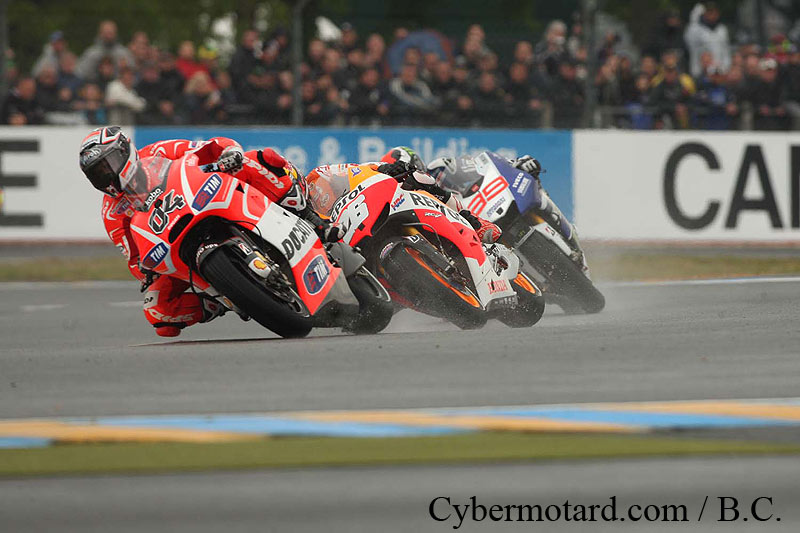 La pluie s’est installée sur le circuit Bugatti du Mans et les pilotes MotoGP s’élancent sur une piste mouillée. 3e sur la grille, Andrea Dovizioso (Ducati N°4) prend le meilleur départ. Il devance Dani Pedrosa (Honda N°26), Jorge Lorenzo (Yamaha N°99), Valentino Rossi (Yamaha N°46) et Cal Crutchlow (Yamaha N°35).