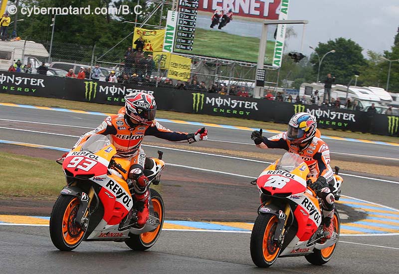 Les pilotes Honda savourent leur doublé !Au MotoGP du Mans, Marc Marquez et Dani Pedrosa savourent leur doublé sur leurs Honda officielles ! Ils sont tous les deux en tête du classement provisoire ! |