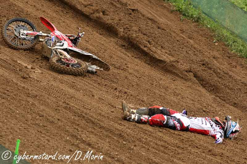 <A name="stjean12">Grosse frayeur</A>Cédric Soubeyras (n°120) nous a fait très peur dès les essais libres du samedi. Dans une partie en descente toujours piégeuse à cause des ornières, le pilote Honda HDi a été désarçonné de sa monture et a chuté assez violemment. Sans réactions suite à une perte de connaissance, le vice Champion de France Elite MX1 2012 a vite été vite en charge par les secours mais a dû déclarer forfait pour le Grand Prix. |