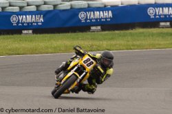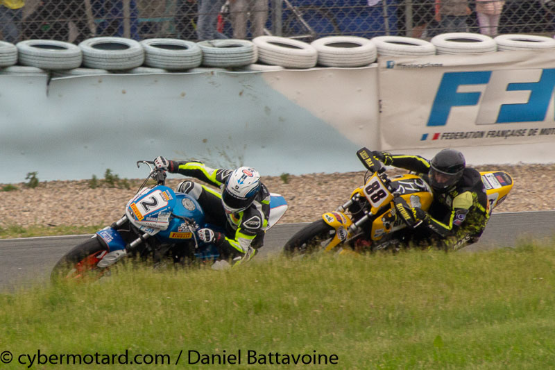 Baptiste Estadieu passe devant Benoit TrichardBaptiste Estadieu (N°2), complètement remis des séquelles d’une chute à Lédenon, met un coup de collier et dépasse Benoit Trichard à 3 tours de la fin pour le gain de la 2e place. Derrière eux, Pierre Volpati termine au pied du podium devant Johan Wang-Chang mais ce dernier est ensuite déclassé pour absence de ventilateur. « Dura lex sed lex ». C’est donc Florent Barnier (Honda n°69) qui récupère la 5e place devant Baptiste Vaucher 6e. |