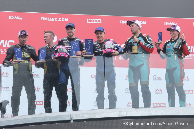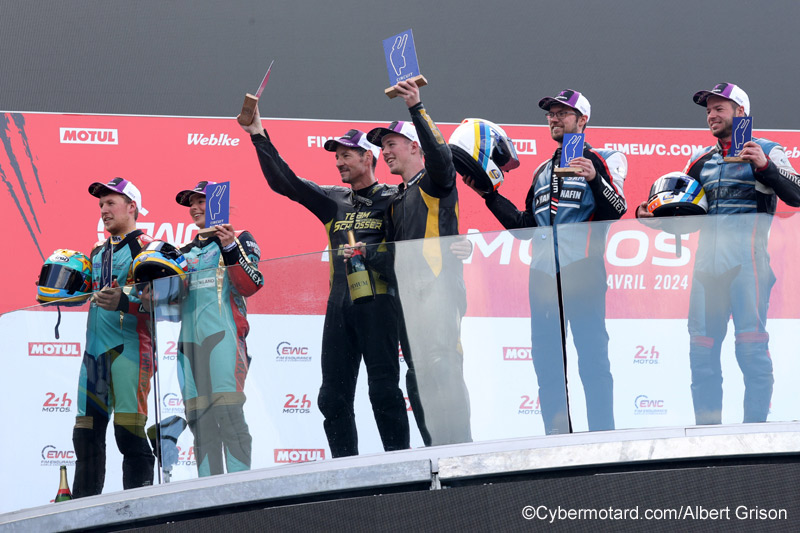 Podium vendredi course 1Comme en FSBK, il y a 2 semaines, le team Rolf Steinhausen, c’est à dire Harry Payne et le français Kévin Rousseau, s’impose, et monte sur la première marche du -nouveau- podium. Sur la seconde, Markus Schlosser et Luca Schmidt et sur la troisième, Todd Ellis et Emanuelle Clément, les champions du monde 2022 et 2023 dont l’objectif 2024 est le Tourist Trophy ! |