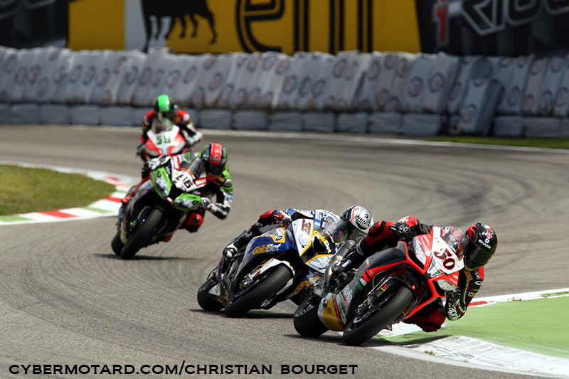En 1e manche, au terme d’ une course passionnante, Marco Melandri réussissait à s’ imposer au guidon de sa BMW S1000R. Des le debut de course, Marco Melandri, Tom Sykes, auteur de la pole, Sylvain Guintoli et Eugene Laverty ont réussi à creuser l’ écart et n’ ont jamais été inquiétés.