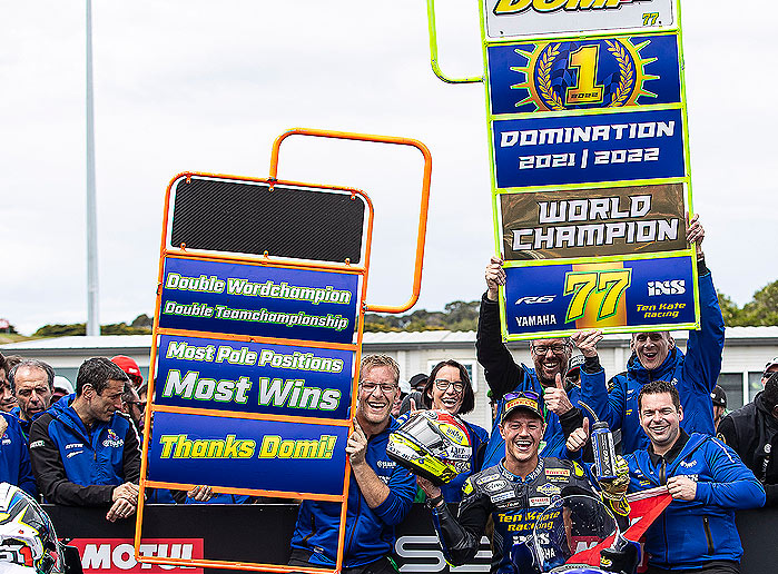 Une saison 2022 bien remplie pour Dominique AegerterDominique Aegerter remporte pour la 2e fois le titre de champion du monde supersport. Si en 2021 il avait réalisé 3 doublé (Misano, Assen et Navarra), en 2022 il double la mise. Il décroche 6 doublés avec 110 points d’avance sur Lorenzo Baldassari. En 2021 cet écart n’était que de 94 points |