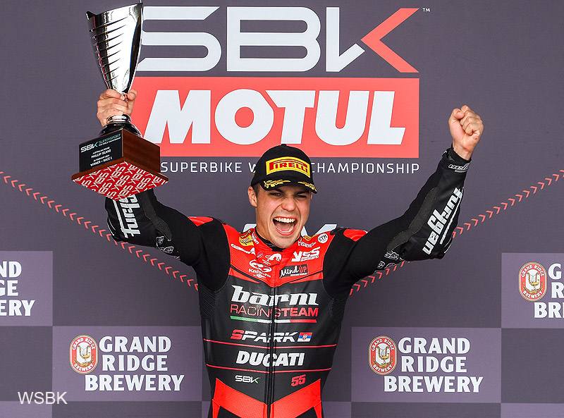 Montella reprend du poil de la bêteYari Montella ( Ducati N°55) a dû sortir de le grand jeu pour s’imposer sur le circuit de Phillip Island. En effet il a dû croiser le fer tour à tour contre Stefano Manzi ( Yamaha N°62), puis contre Marcel Schroetter ( MV Agusta N°23). Au final le pilote du Barni Spark Racing team s’impose avec plus de 6 secondes sur son compatriote. |