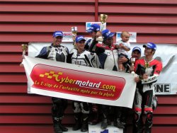 Mathieu Guignard (Ducati Monster 695 n°32) et Thierry Younsi (Suzuki 650 SV n°69) accompagnent Franck Trolard sur le podium après une lutte mémorable entre la Monstro et le SV.