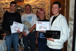 Guido est venu récompenser les pilotesTexsport, notre partenaire cuir, représenté par Guido, récompense le top 3 de la Coupe. De gauche à droite : Guido, Alexis Drain (3ème « moins de 850 » et 7ème scratch), Didier Cantel ( 4ème scrach), Frédéric Pétronelli (2ème « moins de 850 » et 6ème scrach), Clément Fitte (vainqueur « moins de 850 et 3ème scratch), Damien Dugelet (ferronnier d’art) et Samuel Souchon le champion ! |