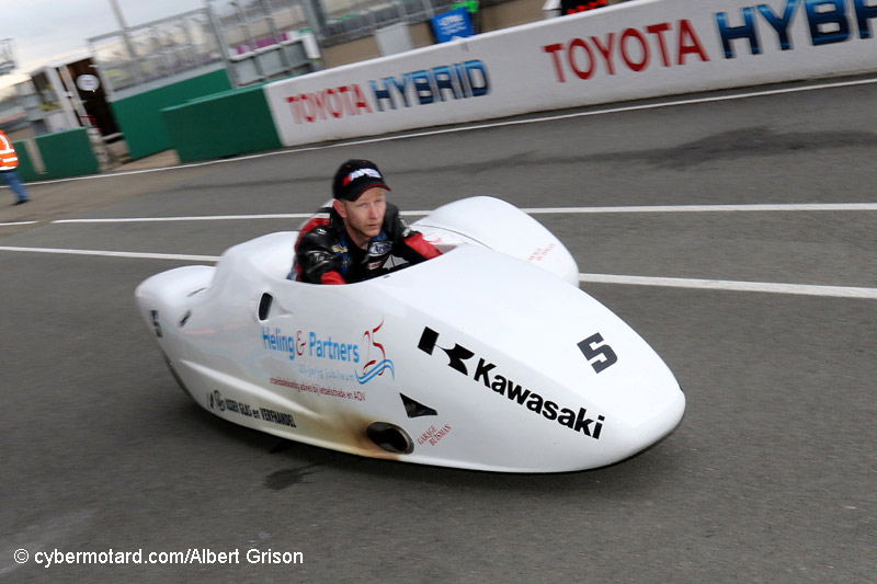 Bennie Streuer, fils d’EgbertIl a été excellent tout le long du week-end, réalisant même un meilleur chrono que Tim Reeves dans la première course. Son moteur Kawa respire la santé ! sans oublier qu’il est très mince, un gros avantage en 600, ce qui n’est pas le cas de Tim Reeves, un solide gabarit. Il est le fils de Egbert Streuer, triple champion du monde. Unique dans le monde du side, le père et le fils ont été champions du Monde. |